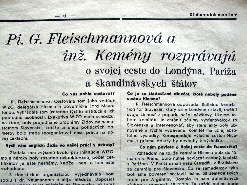 “I travelled as the WIZO President, Hicem delegate and the trustee of the Lord Mayor Fond. I looked for the headquarters of these institutions in London and Paris, along with their leading figures. WIZO executive was in session that debated the issues concerning Jews in the autonomous Slovakia, since the change of our political situation required...